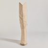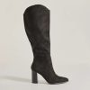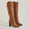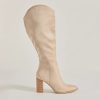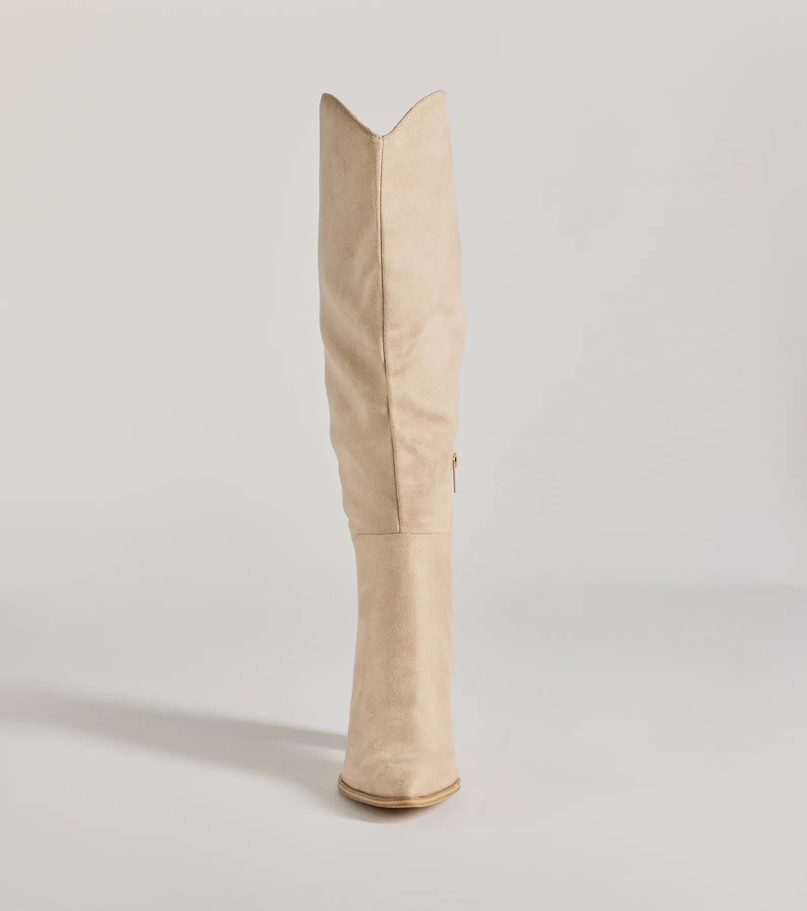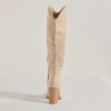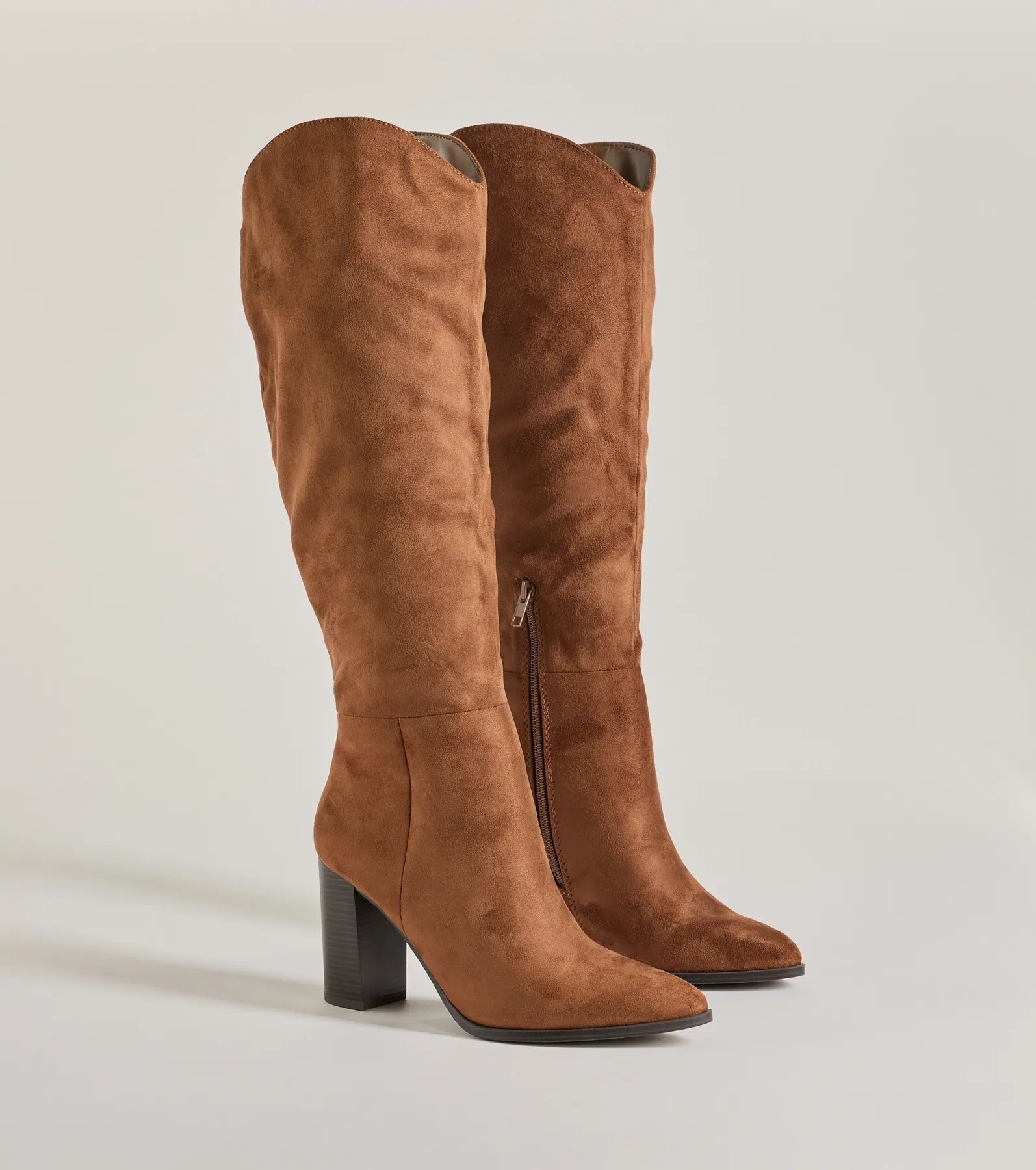 Chic and of the moment. these faux suede boots have a knee-high design perfect for pairing with mini and midi dresses. They feature a pointed toe. a partial inner zipper closure. and a sturdy stacked block heel.