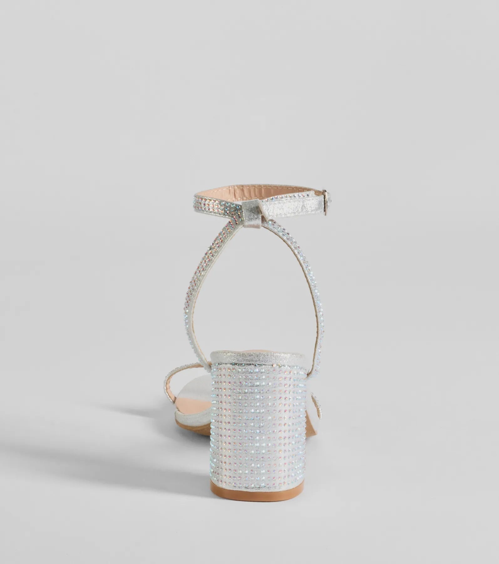 Glamour is ensured with these glitter block heels perfect for a sparkly evening! They feature a sleek square toe with a dainty rhinestone toe and adjustable ankle strap with buckle closure. a rhinestone embellished block heel. and a luxe fit cushioned breathable insole for comfort. Complete the look with a glam .