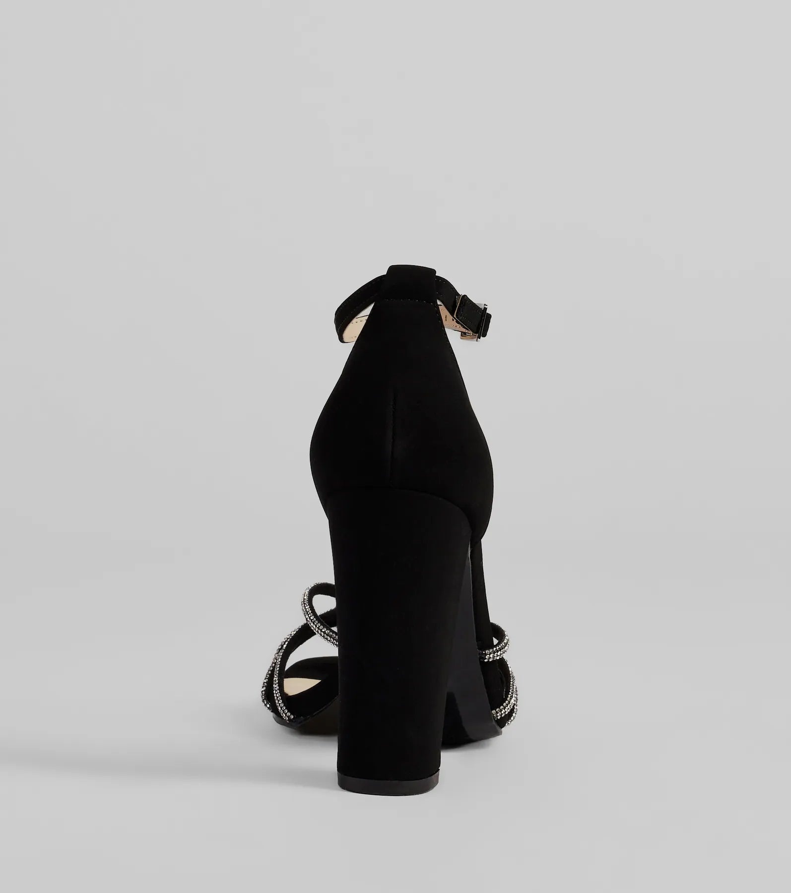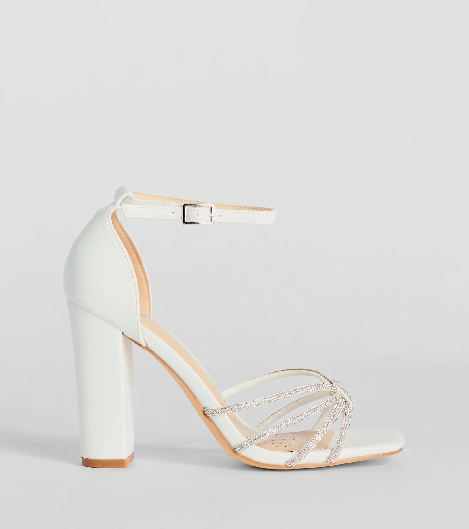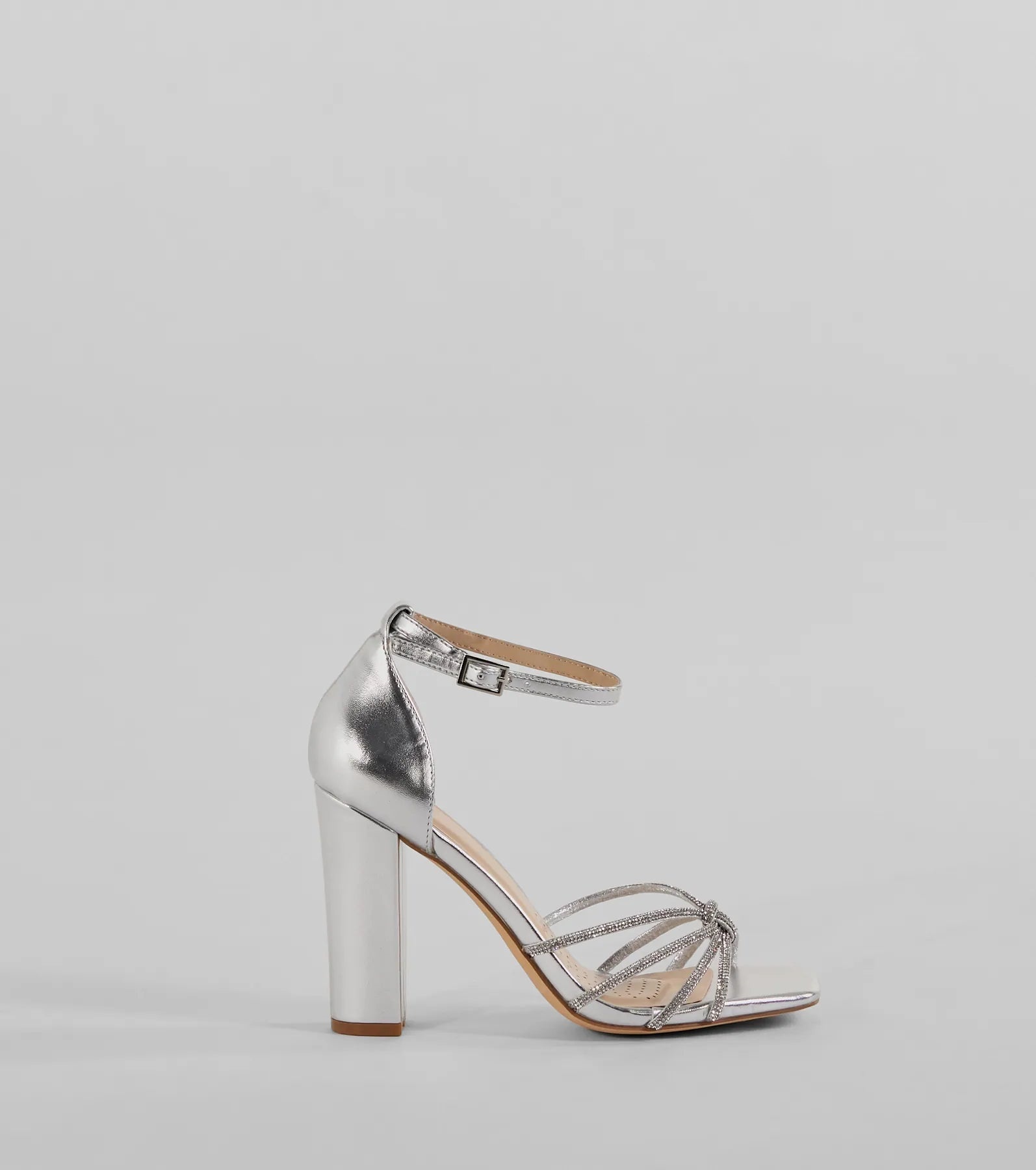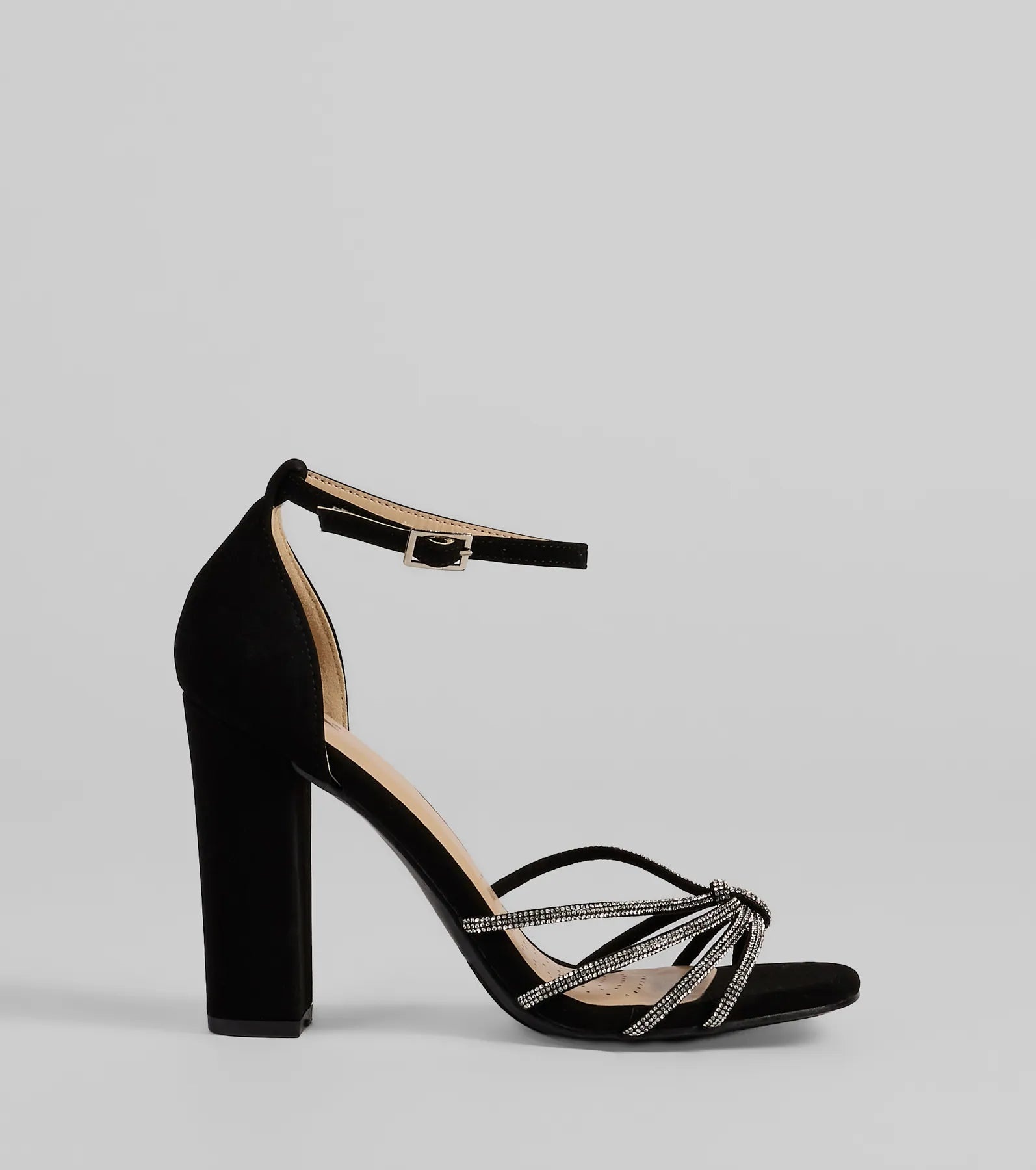 Sparkle up the scene at your next formal affair in these rhinestone strappy faux leather block heels! They feature an open square-shaped toe. a glitzy rhinestone-adorned strappy design with a chic center knotted detail. a thin adjustable ankle strap with a buckle closure. a closed back. a padded insole for comfortable wear. and a sturdy block heel. Style with the matching clutch for a seamless glam look!