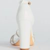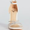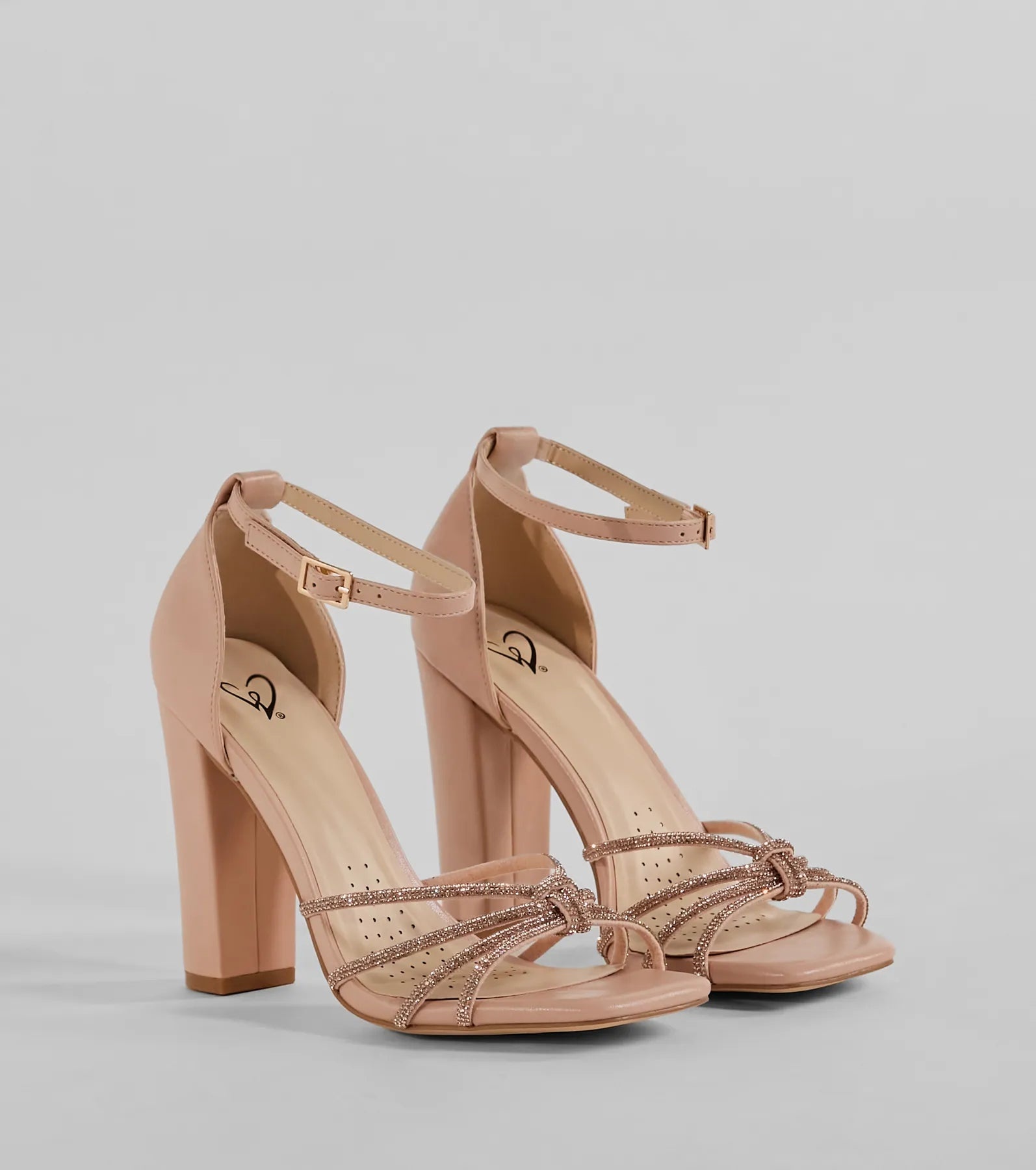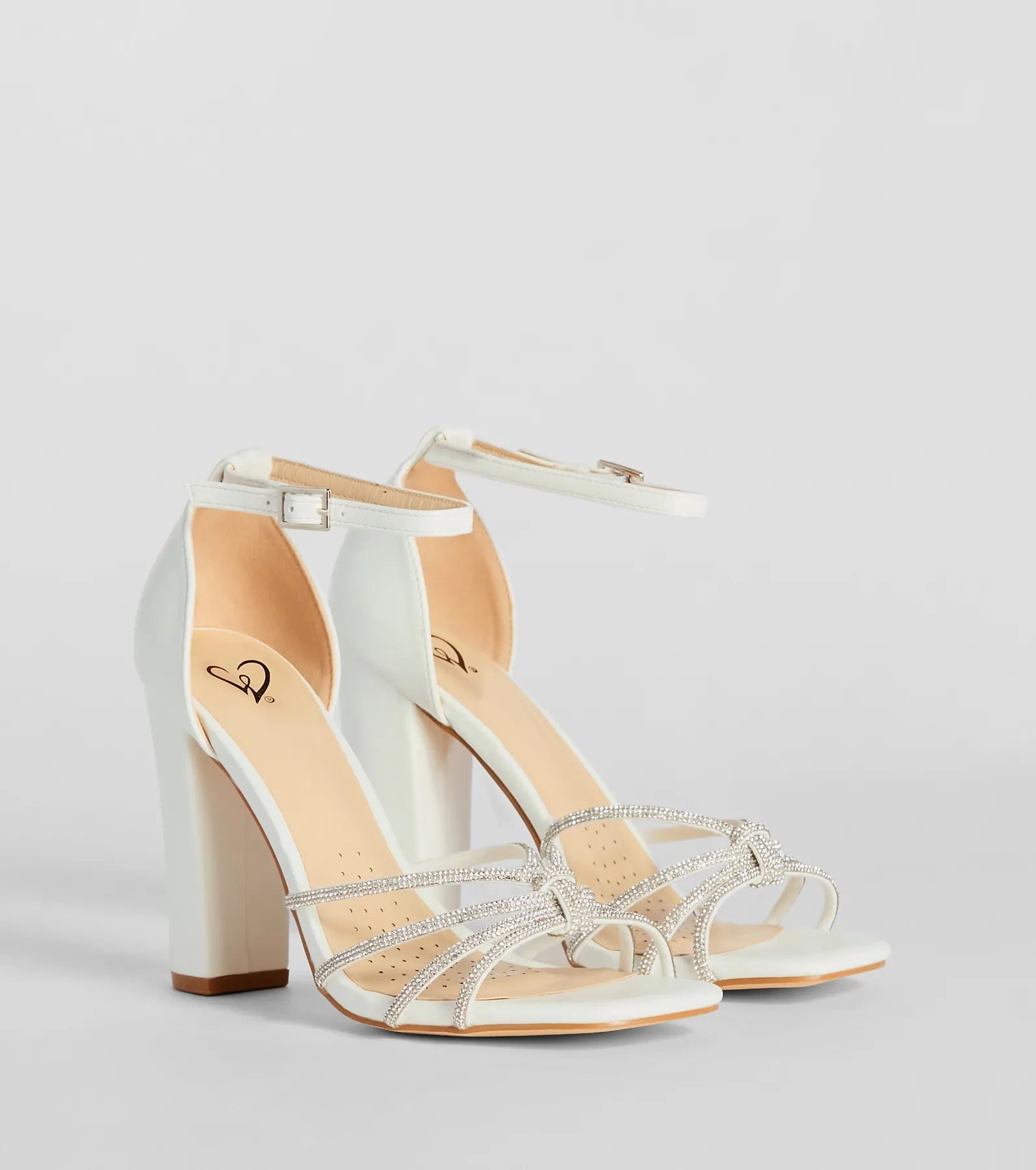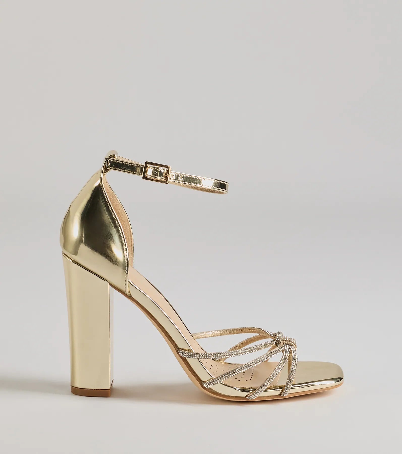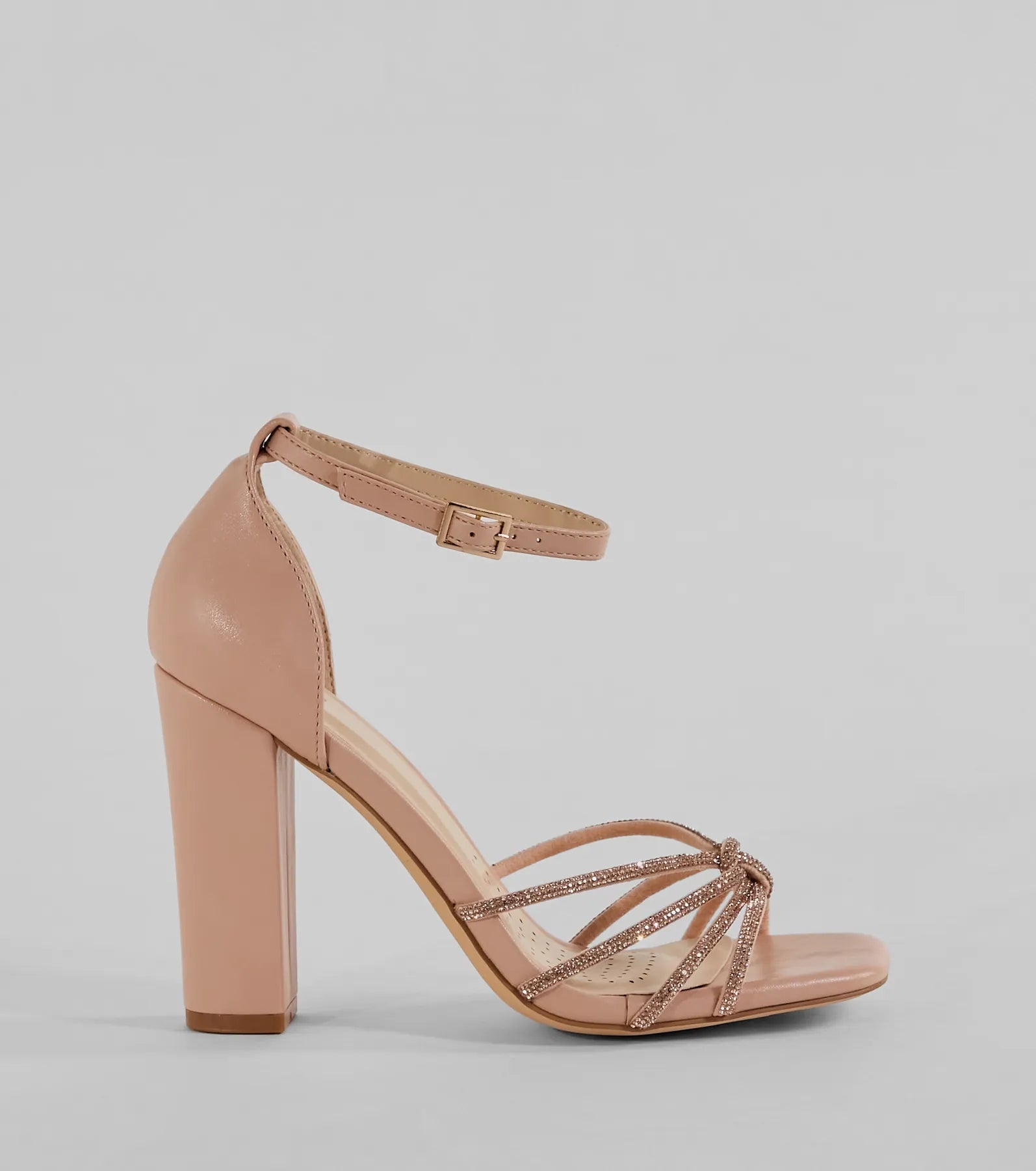 Sparkle up the scene at your next formal affair in these rhinestone strappy faux leather block heels! They feature an open square-shaped toe. a glitzy rhinestone-adorned strappy design with a chic center knotted detail. a thin adjustable ankle strap with a buckle closure. a closed back. a padded insole for comfortable wear. and a sturdy block heel. Style with the matching clutch for a seamless glam look!