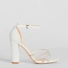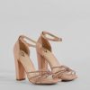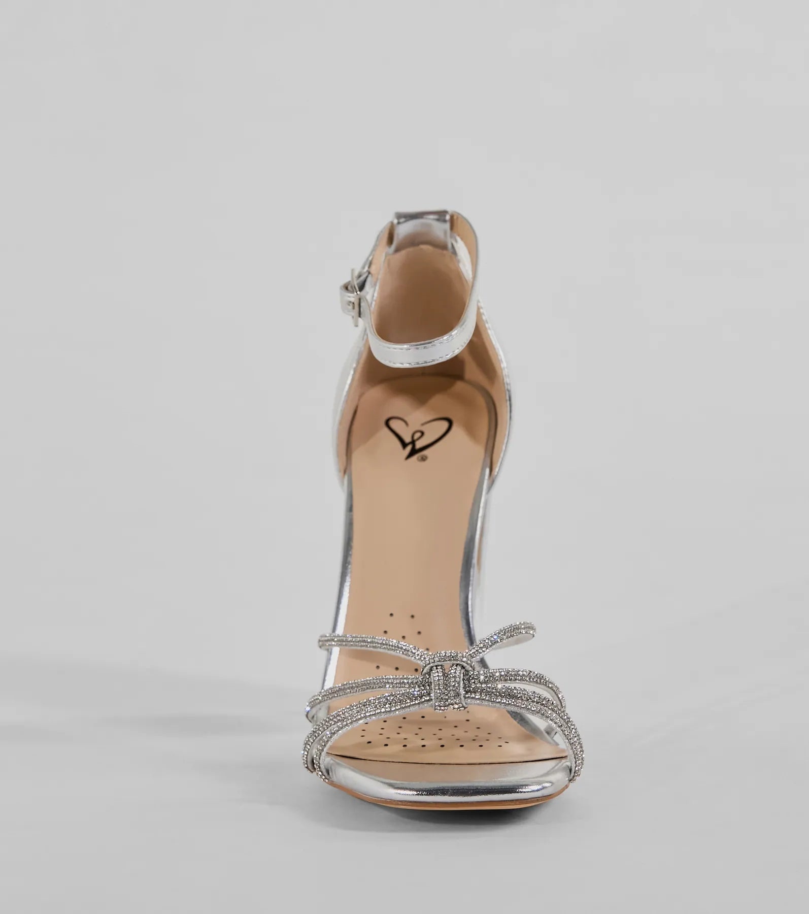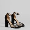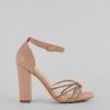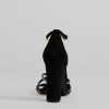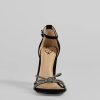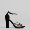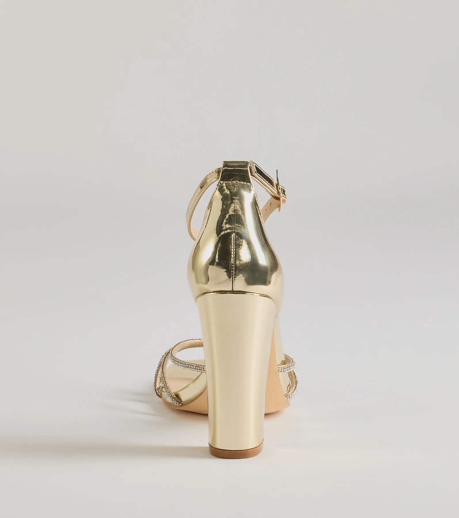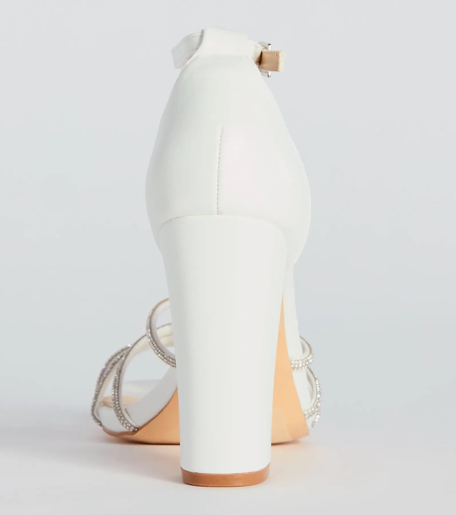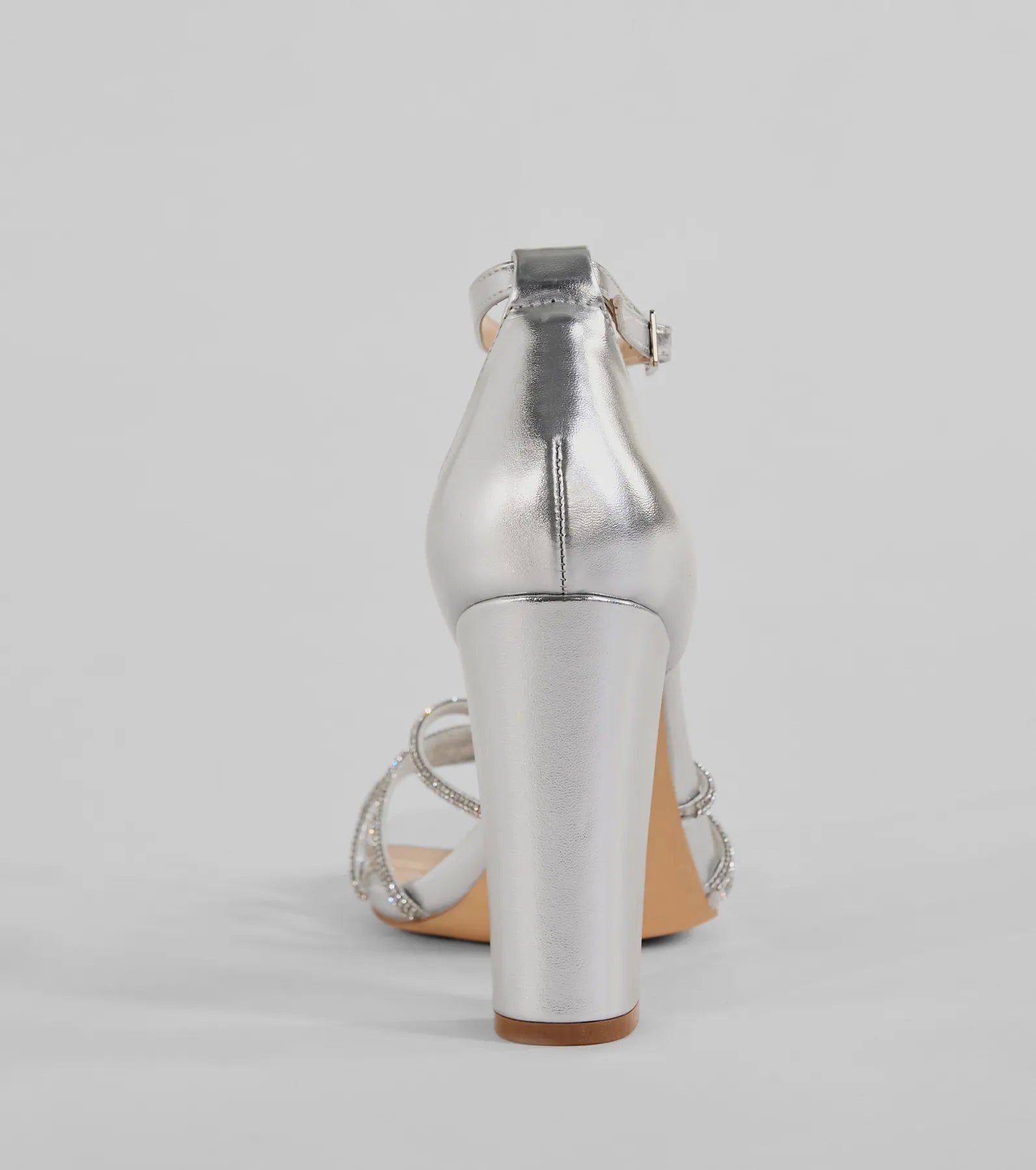 Sparkle up the scene at your next formal affair in these rhinestone strappy faux leather block heels! They feature an open square-shaped toe. a glitzy rhinestone-adorned strappy design with a chic center knotted detail. a thin adjustable ankle strap with a buckle closure. a closed back. a padded insole for comfortable wear. and a sturdy block heel. Style with the matching clutch for a seamless glam look!