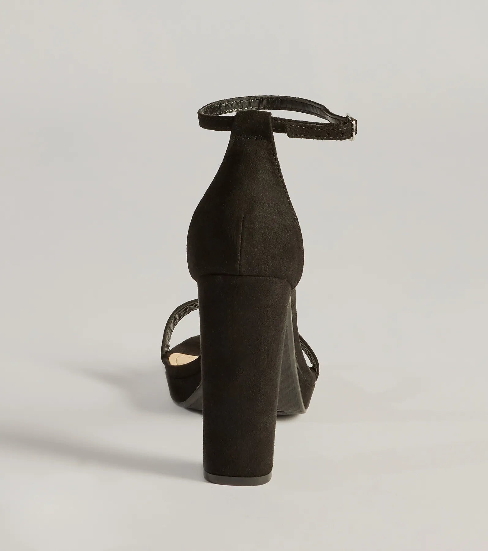 Stylishly elevate your night-out looks with these chic platform heels featuring an open almond-shaped toe with a strap. a thin adjustable ankle strap. and a tall block heel. Complete your outfit with a sleek clutch.