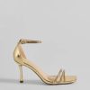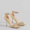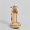 Take luxe steps in these metallic stiletto heels featuring a square toe with rhinestone embellished toe straps. a luxe fit cushioned insole. a closed ankle. and an adjustable ankle strap with buckle closure.